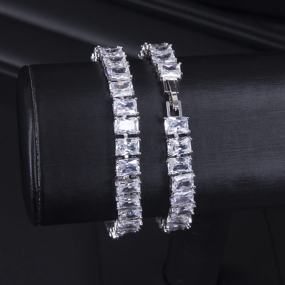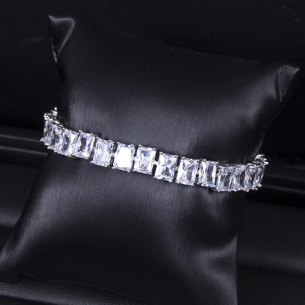 A refined silver bracelet adorned with precision-cut baguette crystals, designed to deliver timeless sparkle and effortless elegance.