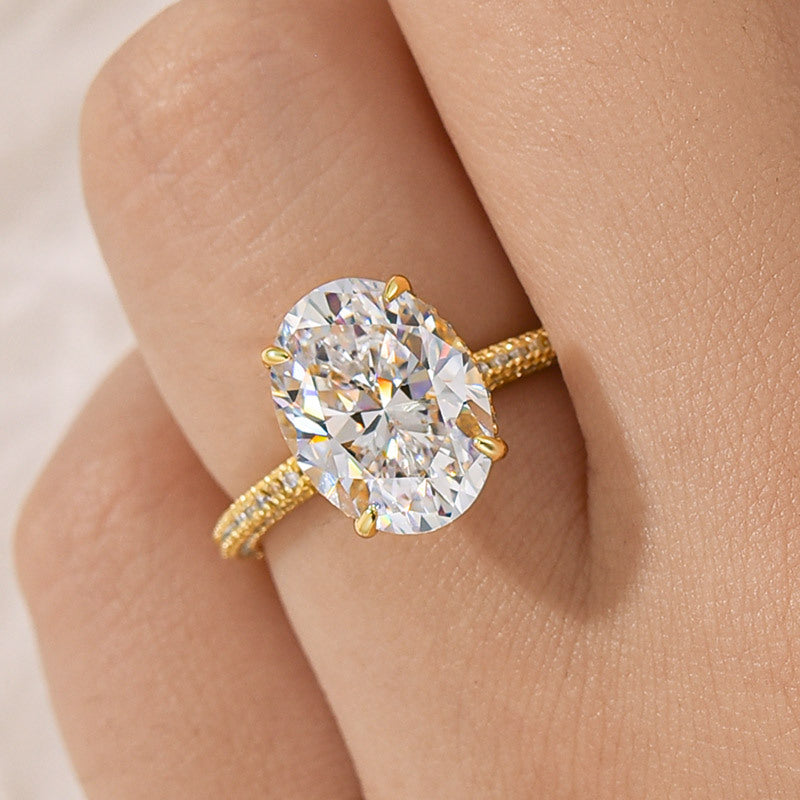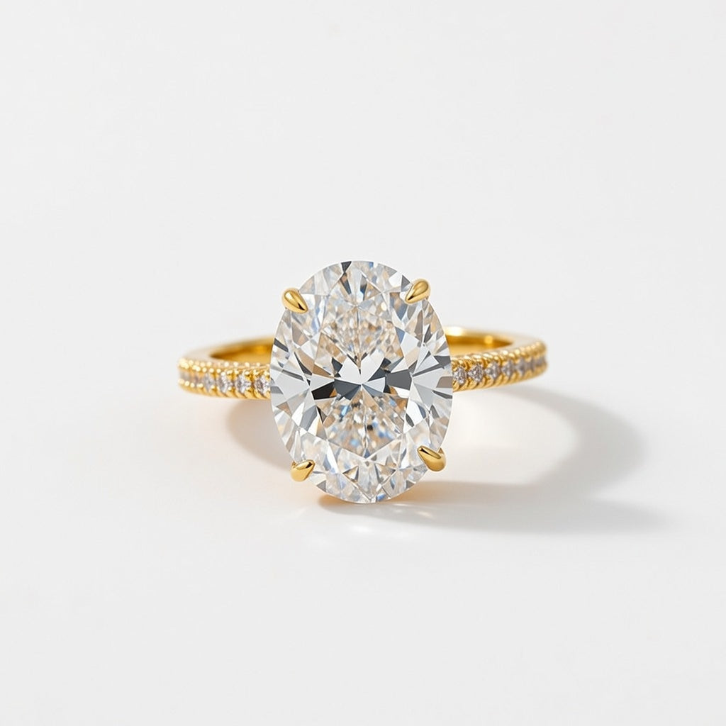 2 Carat Oval Cut Diamond Engagement Ring in 18K Yellow Gold | Pavé Diamond Band | Classic Four-Prong Solitaire.