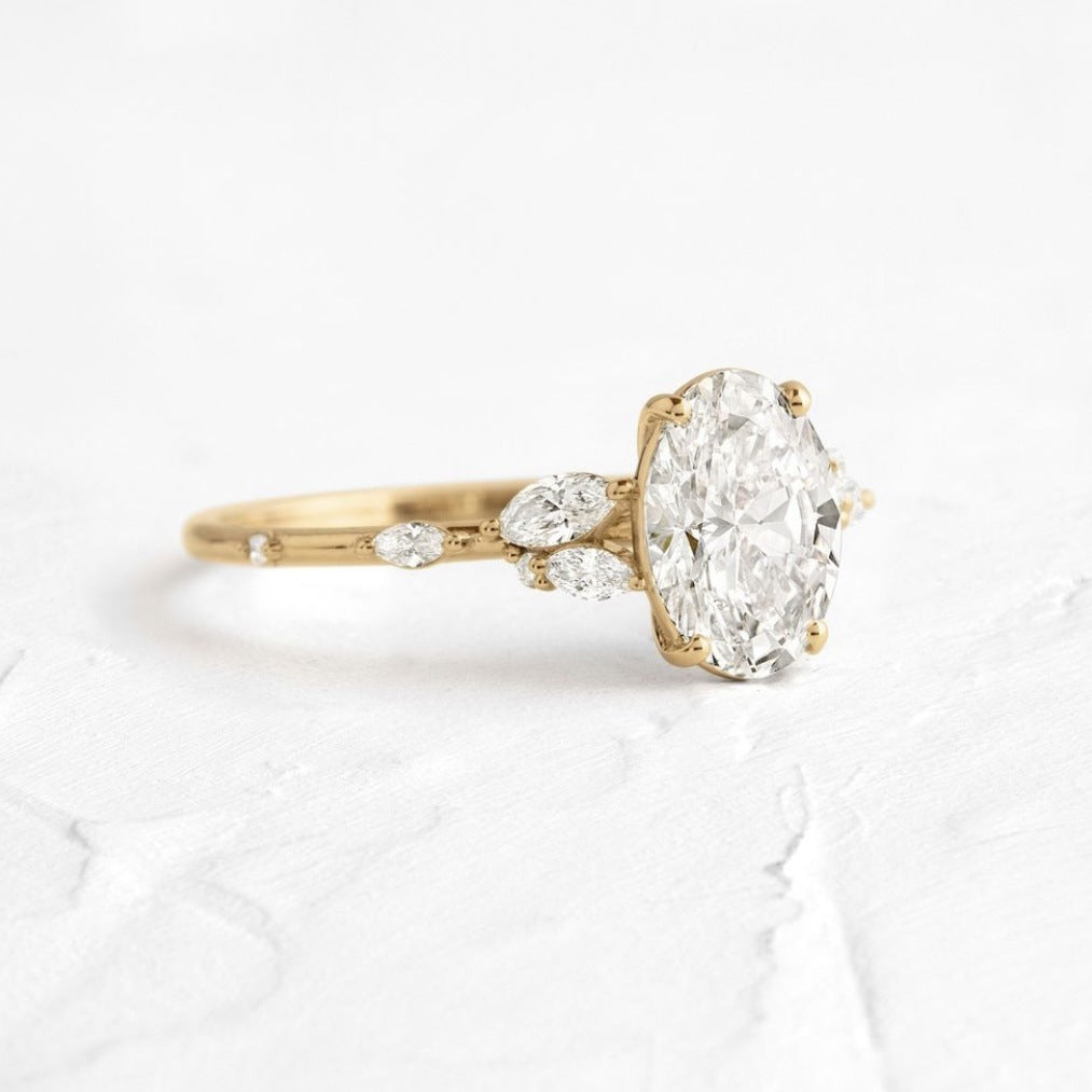 Elegant oval-cut solitaire ring featuring a brilliant center stone with delicate side accents in a refined gold-tone finish. Designed for modern elegance with soft sparkle, balanced proportions, and a premium diamond-look appeal.